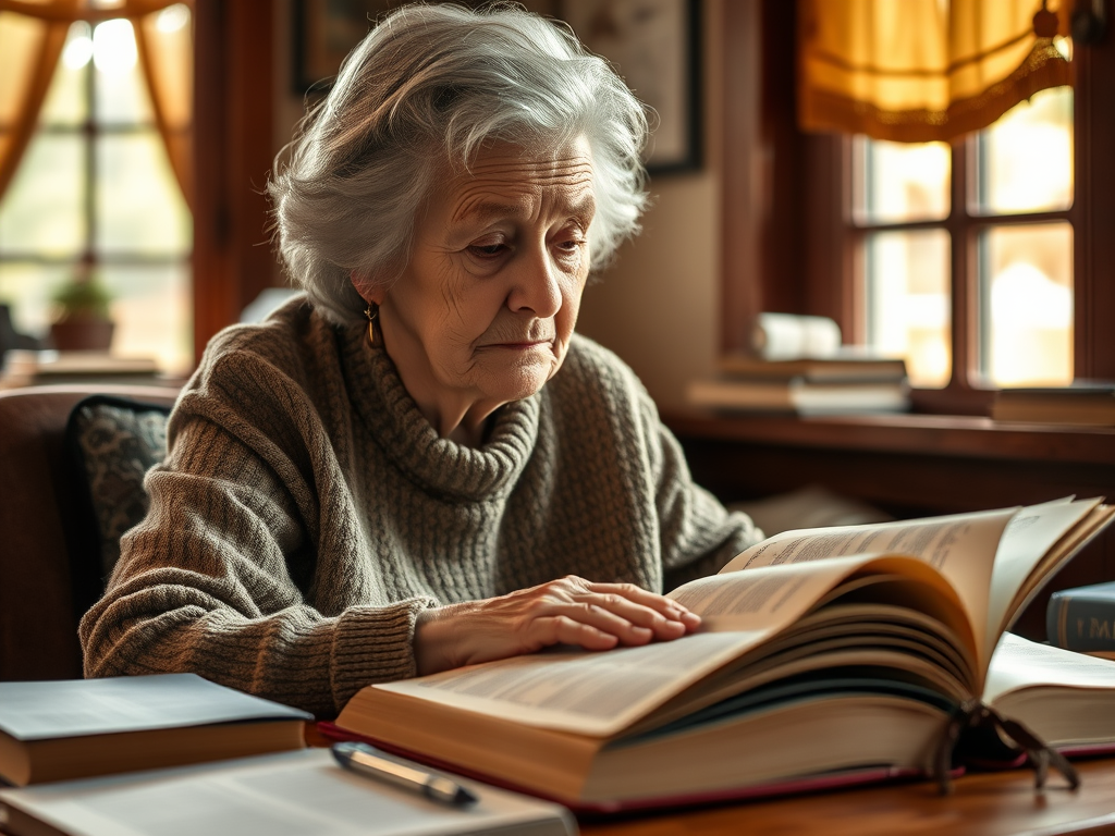 An elderly woman engaged in Bible study, reflecting on scripture with resources and notes.